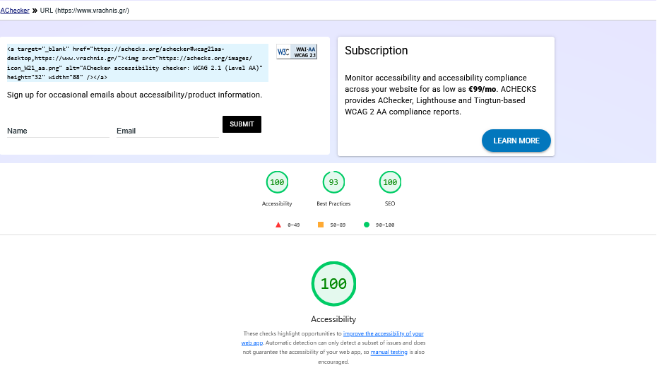 Παρακολουθούμε τακτικά την απόδοσή του www.vrachnis.gr μέσω σχετικών εργαλείων με στόχο τη συνεχή διατήρηση και βελτίωση της προσβασιμότητας για όλους τους χρήστες.